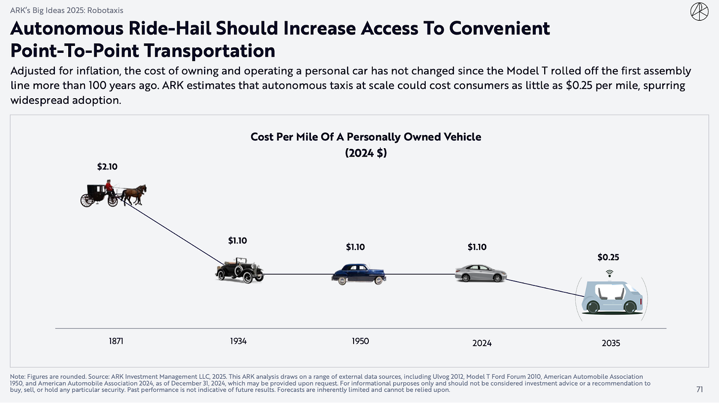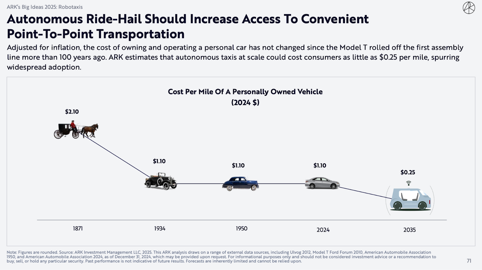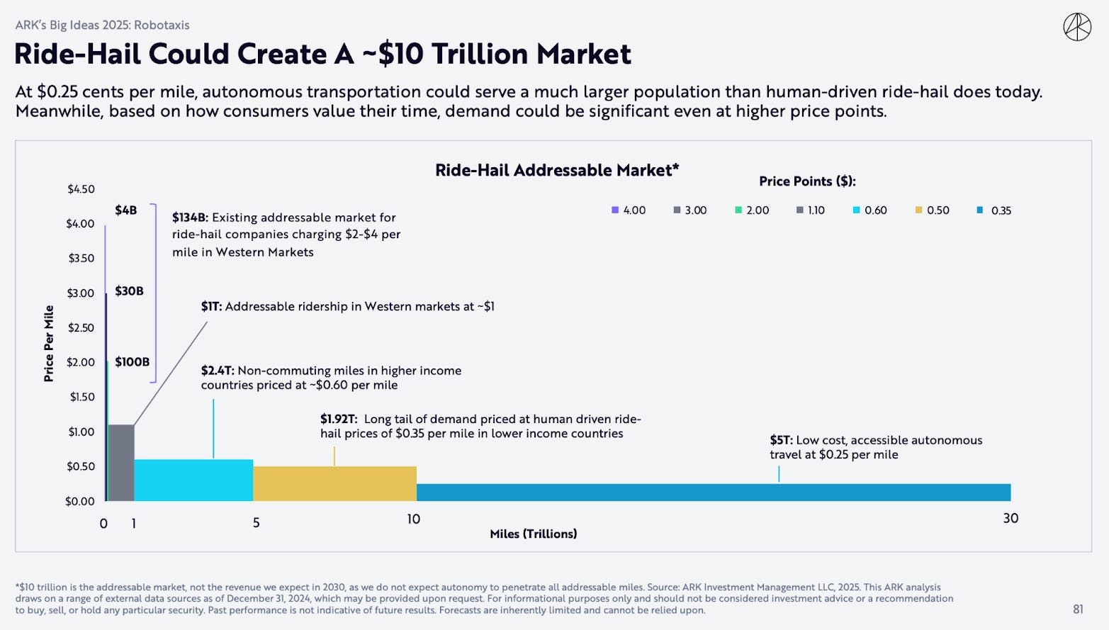 At $1 per mile, ARK sees a $1 trillion market. At $0.60, it’s comparable to driving a car you already own. At $0.25 per mile, we’re starting to induce new demand and the addressable market could hit more than $10 trillion.