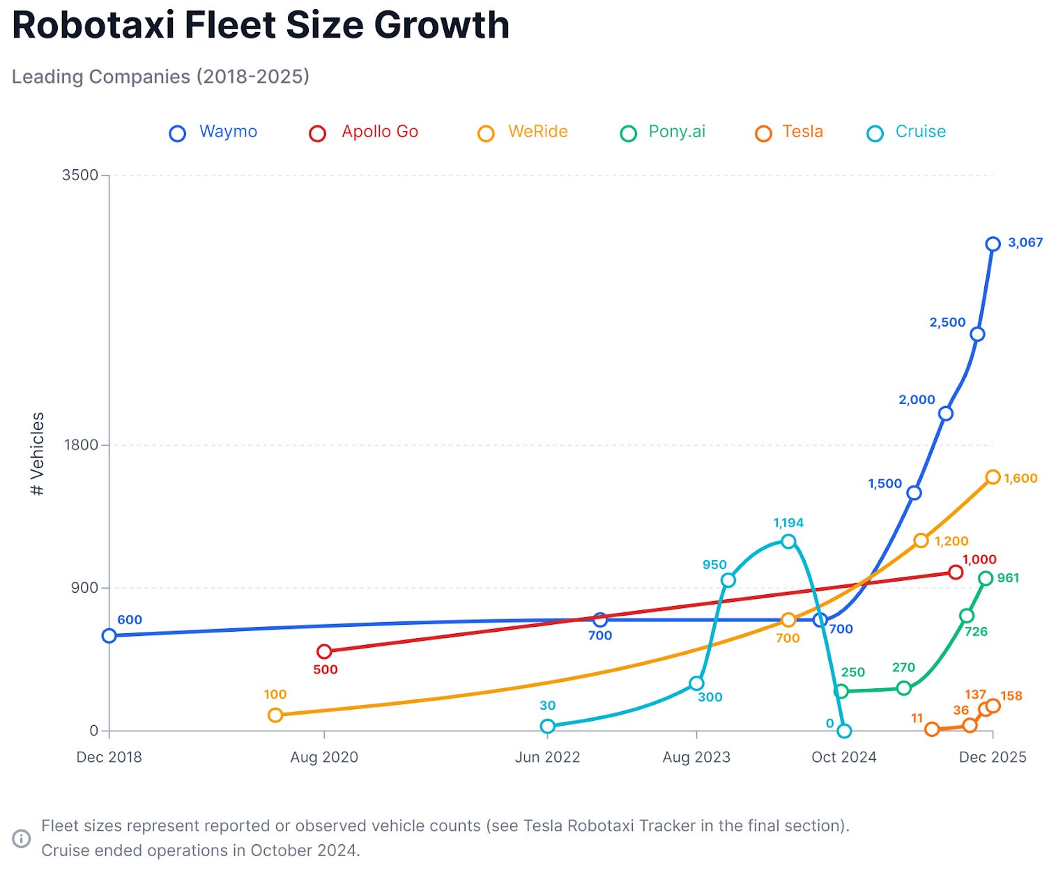 For years, most robotaxi fleets stayed small. That changed in 2024. Waymo held steady at around 700 vehicles for years, then added more than 2,300 new vehicles in the last 18 months alone. They now operate over 3,000 vehicles in the US, nearly double the size of the next largest fleet. Apollo Go sits at around 1,000 vehicles, notable given their ride volume (they’re getting more rides per car, or counting differently).
