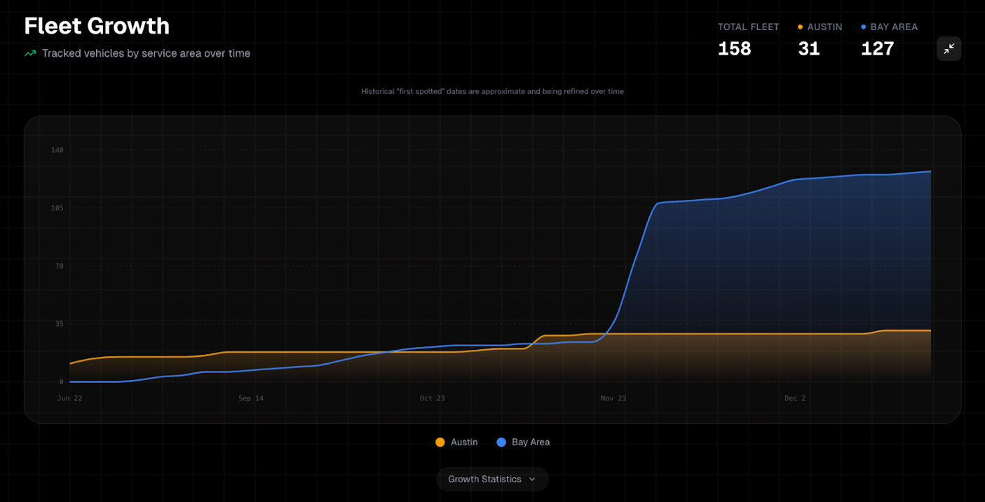 This project, built by Ethan McKanna, takes a clever approach to fleet tracking. Tesla doesn’t publish fleet numbers, so the community started documenting license plate numbers. Texas issues sequential plates, so counting unique sightings gives you a fleet estimate. As of mid-December, the tracker shows 158 Tesla vehicles: 31 in Austin, 127 in the Bay Area. Despite the name, it tracks Waymo too. If you spot a robotaxi in either market, submit a sighting through their site.
