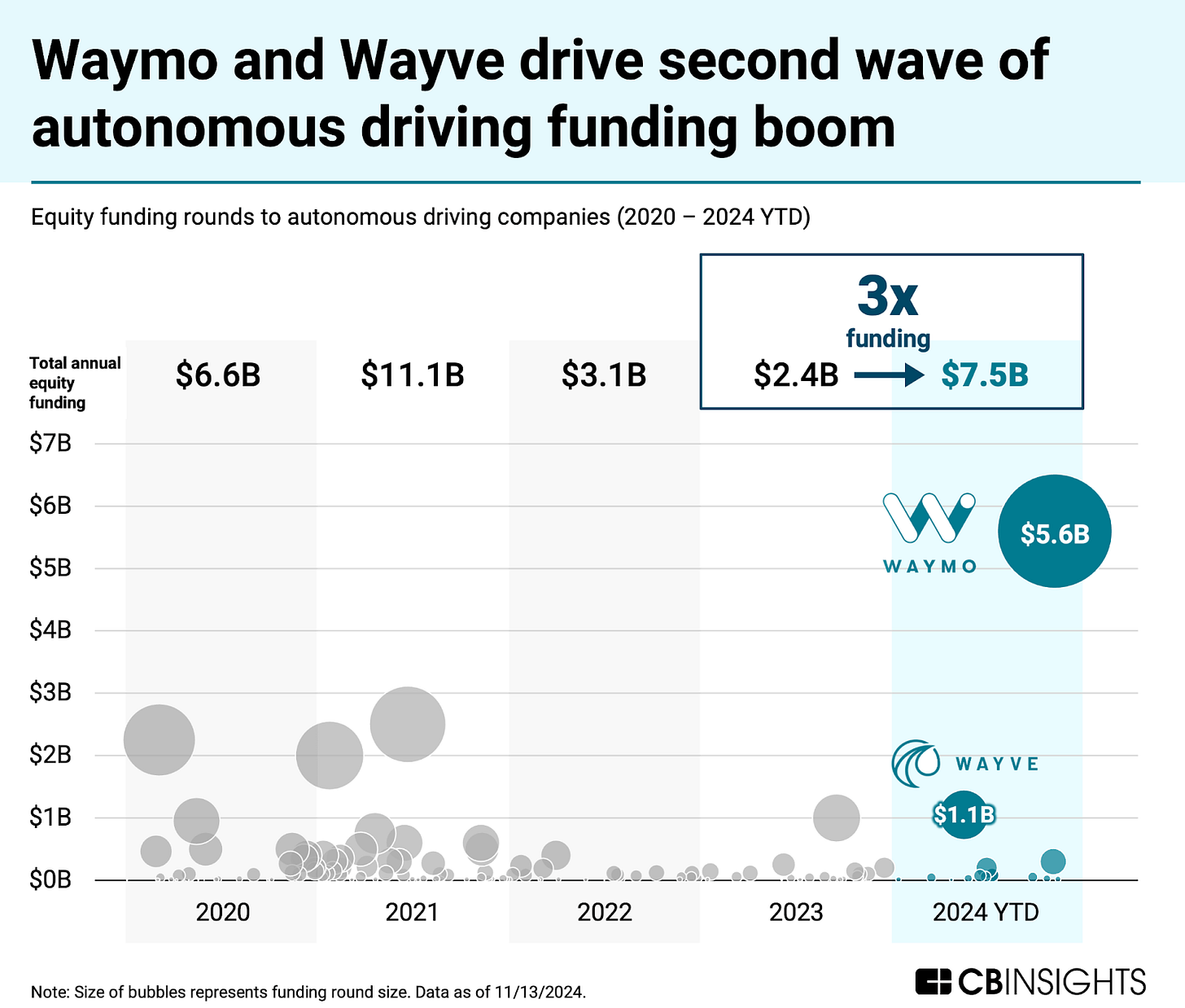 This CB Insights chart shows AV funding hitting $11B in 2021, collapsing to $2.4B by 2023, then tripling to $7.5B in 2024. The gray bubbles are funding to other companies. Waymo and Wayve (highlighted in teal) account for 90% of 2024's total. Waymo alone raised $5.6B at a $45B valuation. They're now reportedly raising another $15B at a valuation above $100B. That's more than double what they were worth a year ago. If that round closes as advertised, it alone would double 2024’s total funding illustrated in this chart.