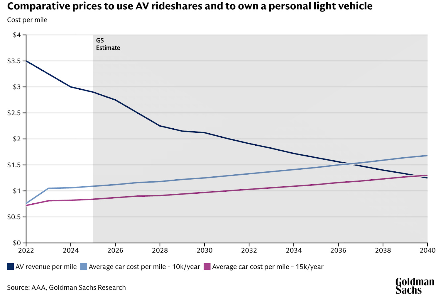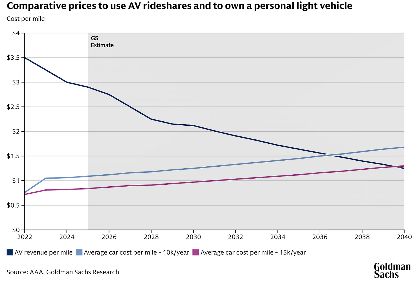 So when does ridehail actually get cheaper than driving? Goldman Sachs projects somewhere between 2036 and 2040, depending on how much you drive. AV ridehail today costs riders around $3 per mile. Car ownership sits at $1-1.50 per mile.