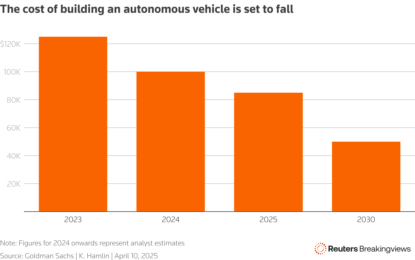 Goldman Sachs projected in early 2025 that autonomous vehicle costs would fall from roughly $120,000 to $50,000 by 2030. The industry is ahead of schedule. Waymo’s new Zeekr RT is estimated to cost around $75,000, already below Goldman’s 2025 projection. Baidu’s RT6, announced in May 2024, costs around $28,000, beating the 2030 target by six years.
