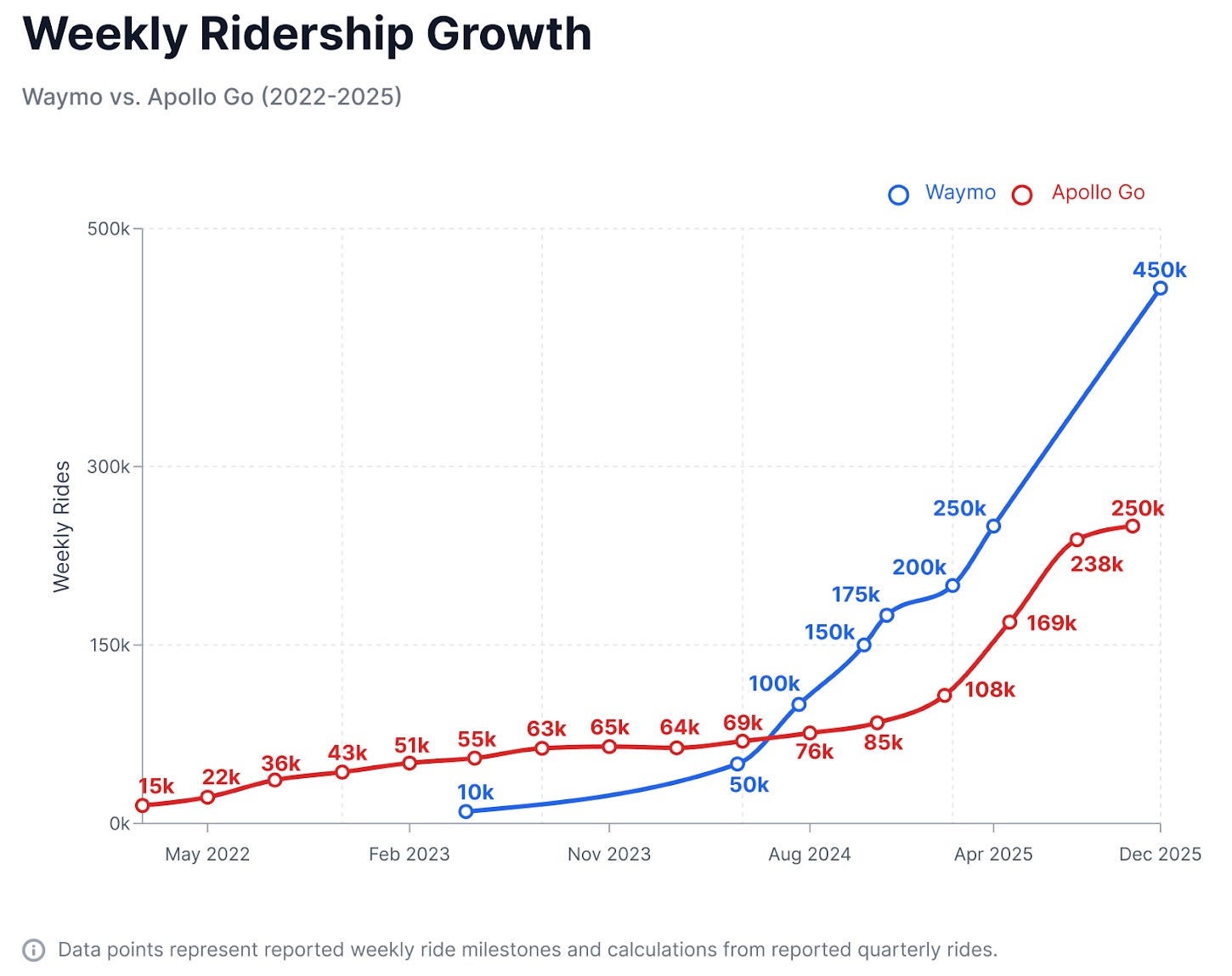 But the growth trajectories are different. Waymo’s curve went exponential in mid-2024 and hasn’t slowed. Apollo Go’s growth has been steadier and more linear. Today, Waymo completes nearly twice as many weekly rides as Apollo Go, despite operating in fewer cities. And the gap may widen: Waymo plans to operate in at least triple the number of markets by the end of 2026, while Apollo Go’s expansion targets have been more conservative2.