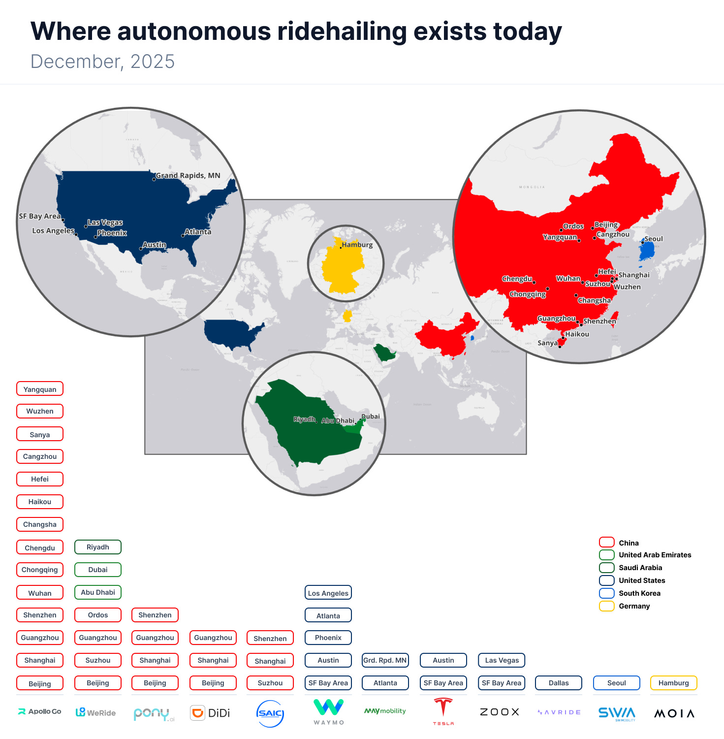 China has had competing robotaxi services since 2022, with multiple companies offering driverless rides in the same cities, directly bookable, and charging fares. Outside China, only Waymo has cleared that bar. Zoox and Tesla are still working with waitlists, safety drivers, or both. 2026 could change this, but a lot needs to go right. Waymo plans 12 new cities. Zoox and Tesla need to clear their respective hurdles in SF and Austin.