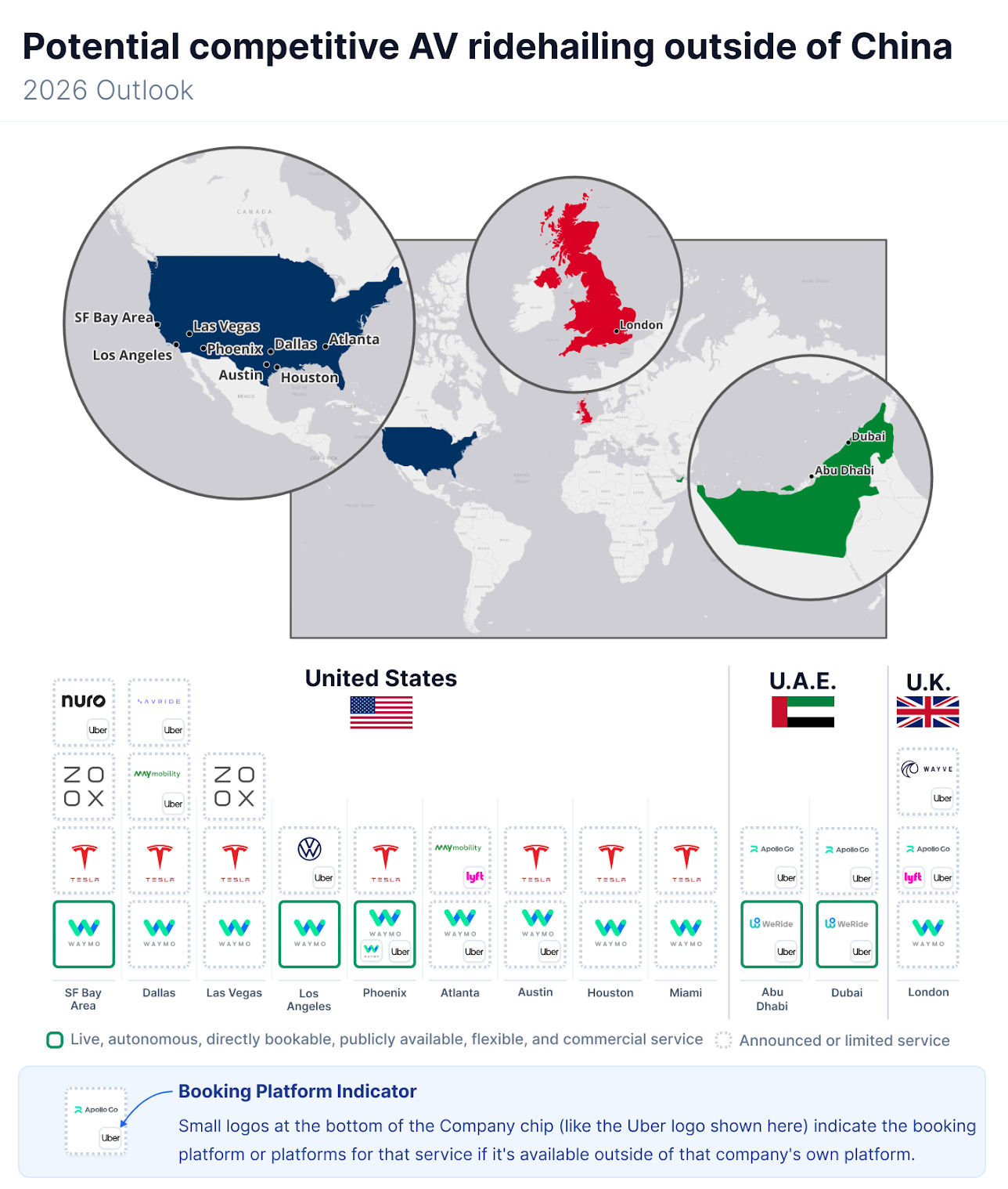 Announced for 2026 but not yet live: Nuro (SF Bay Area), May Mobility (Dallas), Tesla (Dallas, Las Vegas, Phoenix, Houston, and Miami), VW (Los Angeles), Waymo (Dallas, Las Vegas, Houston, Miami, and London), Apollo Go (Abu Dhabi and Dubai), and Wayve (London).