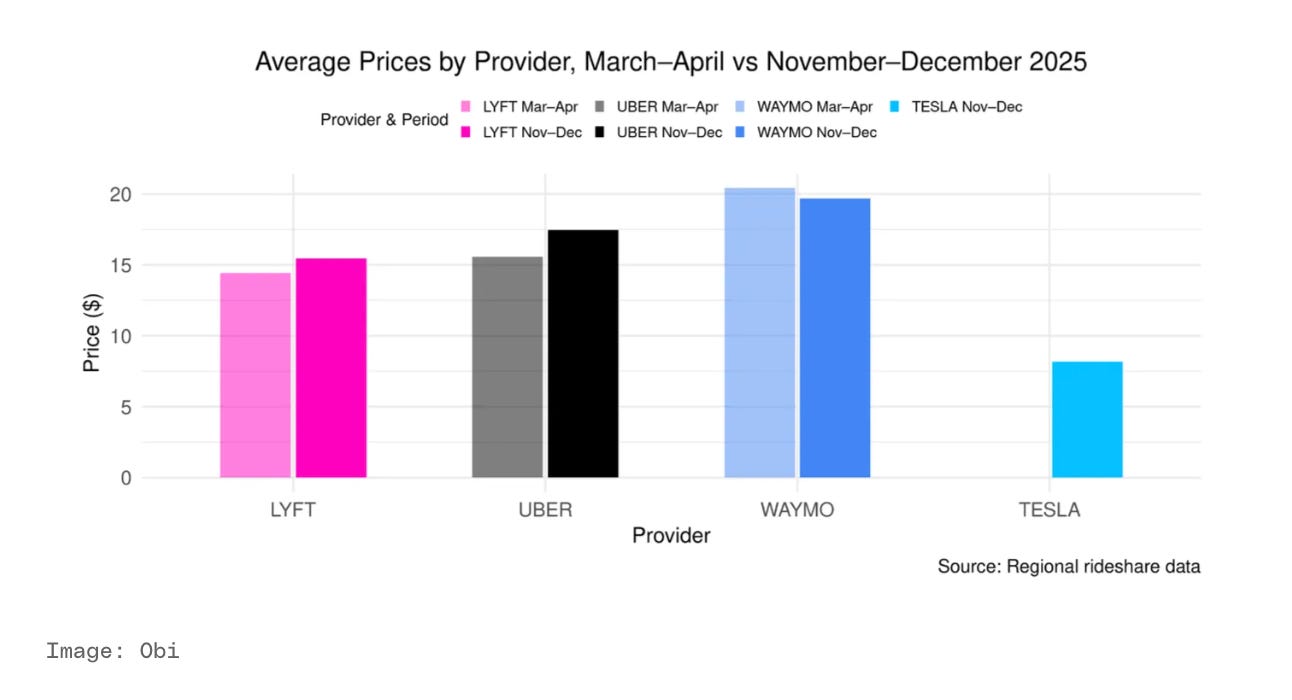 Tesla is, for now, hands down the cheapest paid option compared to Waymo, Uber, and Lyft. With its massive service area across the Bay Area and ability to drive on highways, I treat it as the budget ride. Low prices seem to have created artificial scarcity, especially as it becomes available to more riders and their fleet scales (latest CPUC data registered 1655 Tesla robotaxis in CA). It’s gotten better, but there are still rush hour and weekend evening times when high Tesla demand and high Waymo prices force me back to human-driven rideshare. Obi’s latest report based on data collected late last year proved that Tesla is significantly cheaper than other AV options, averaging $8.17 per ride.