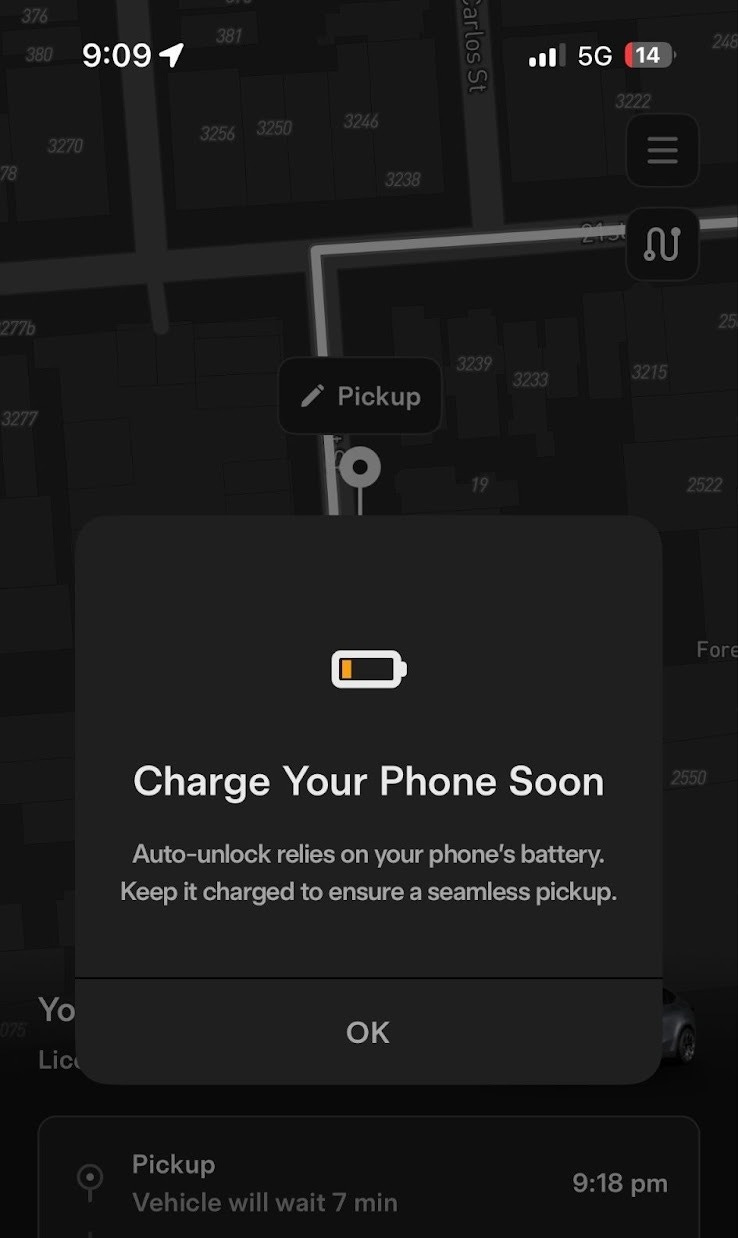 I appreciate Tesla’s robotaxi app alerts when my phone battery is low and could prevent automatic door unlock. That said, it’s still frustrating that I can’t see the trip price once I’ve booked the ride, and I can’t enter a specific pickup address in their app. Same goes for Zoox, in addition to not being able to see estimated ETA until I get in and start the ride on the screen. I’ve also noticed that Tesla’s routes around the Mission often differ from my own car’s navigation, which makes me wonder if there is similar risk-avoidance logic to Zoox’s circuitous routing.