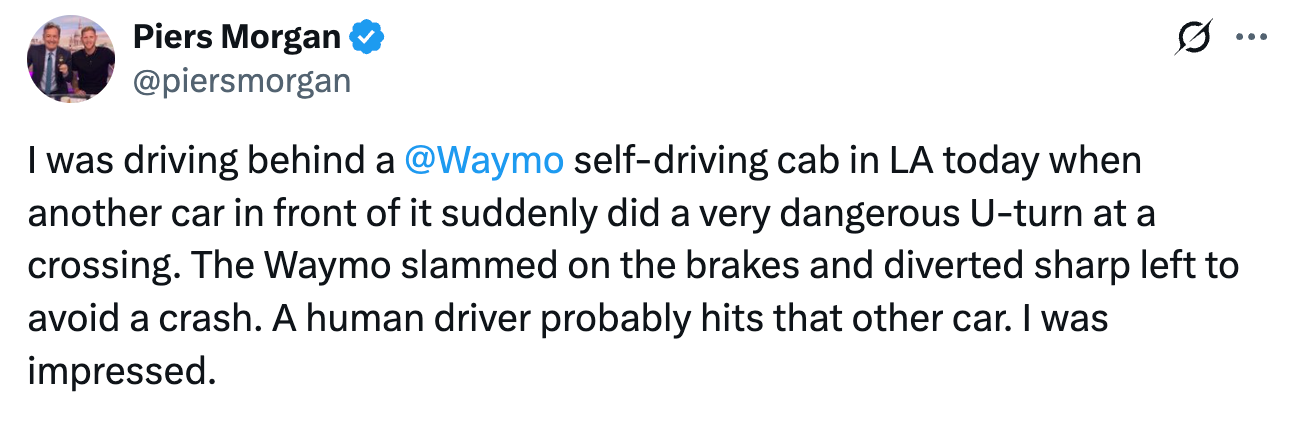 ‘Took a Waymo from Los Altos to a working meeting in Mountain View today — just a regular day talking AVs and AI’ (link).