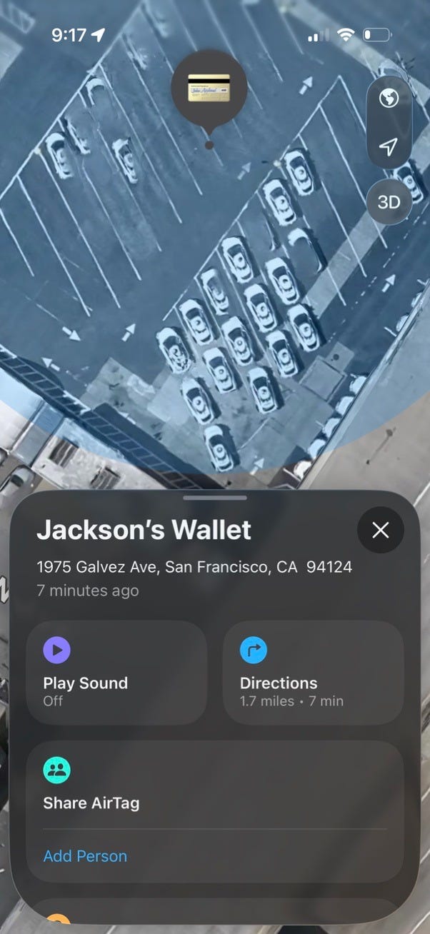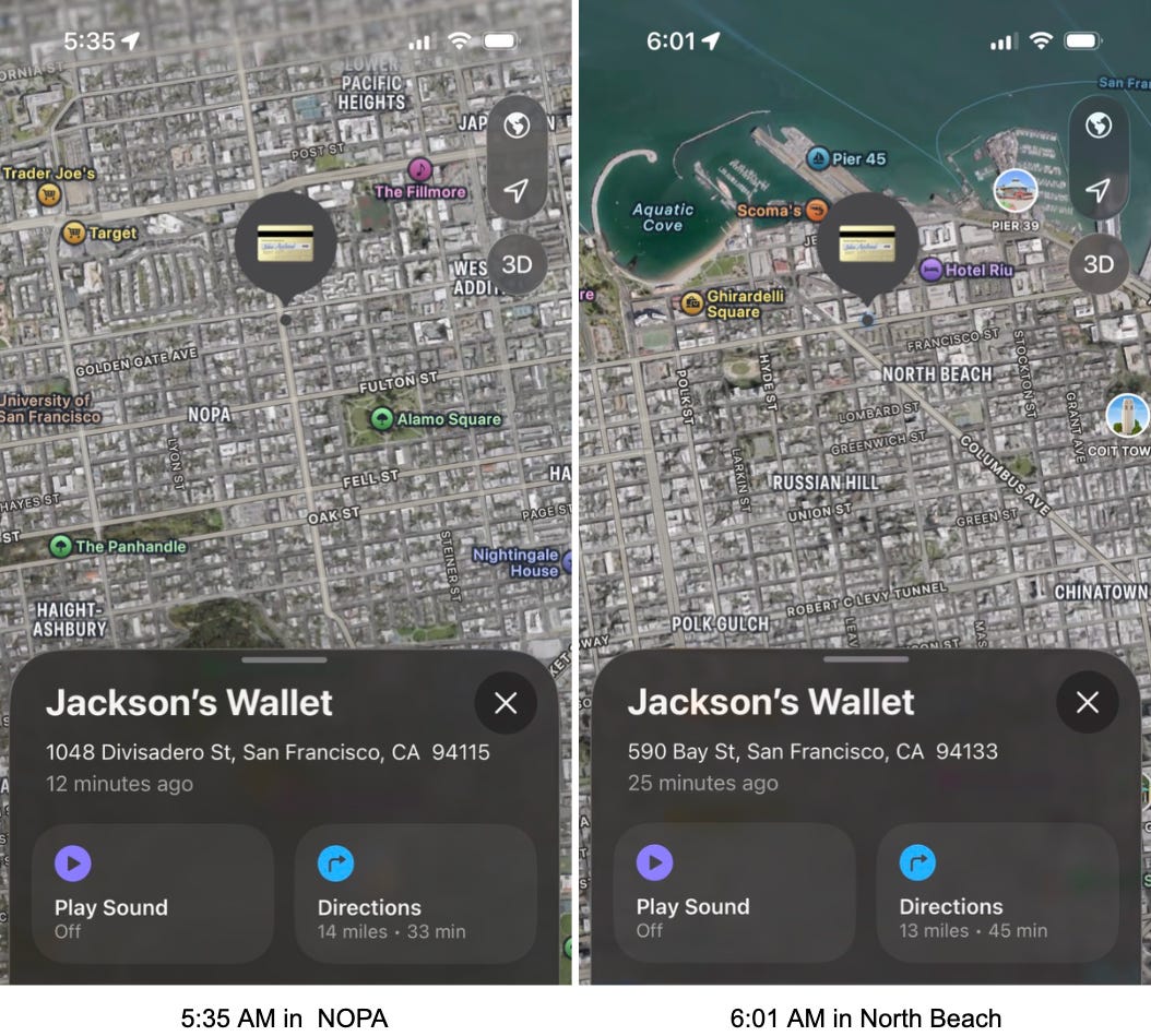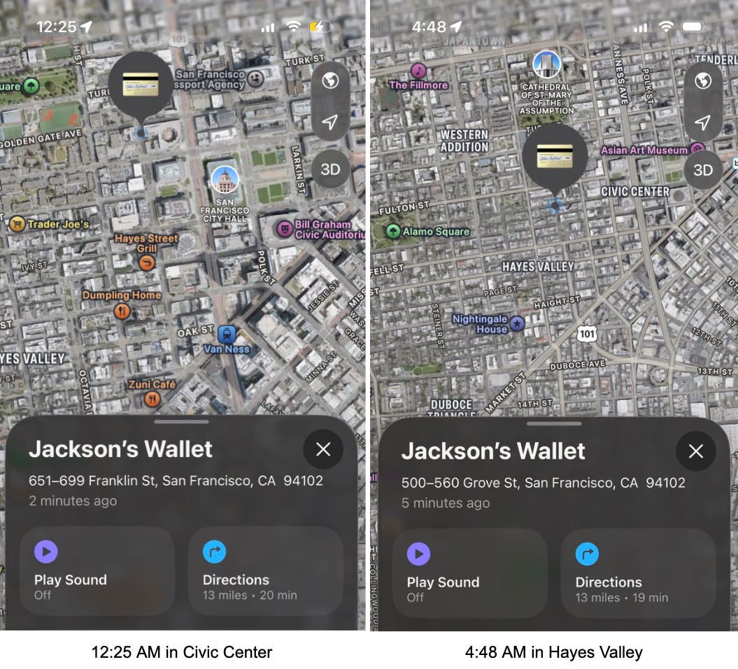 Even though the Waymo came back to the depot just like they told me, nobody apparently found the wallet during the search, because at 12:25 AM my wallet was at Franklin and Golden Gate. At 4:48 AM it was at Grove and Octavia. By 5:21 AM, Geary and Divisadero. I kept waking up and checking Find My. I couldn’t help it.