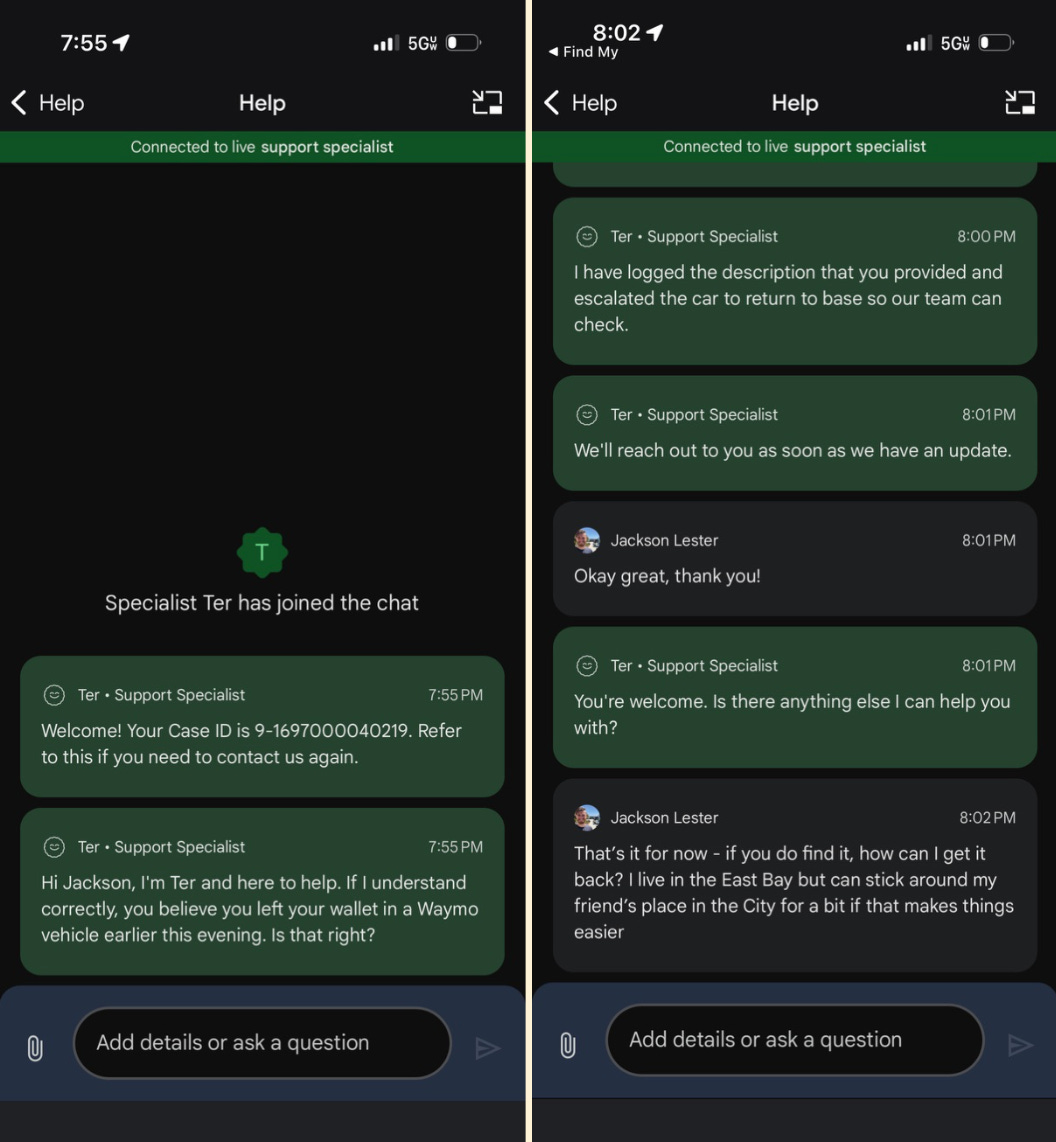At 7:55 PM, I started a support chat through the Waymo app. Ter, the agent, was professional and asked all the right questions. What did it look like? A navy blue Dakine wallet. Where might it be? On the floor behind the passenger seat. Then they said something interesting: “I have logged the description you provided and escalated the car to return to base so our team can check.”