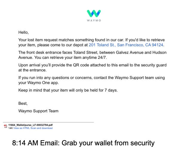 At 8:14 AM Tuesday morning, I got an email telling me to come to 201 Toland Street and show a QR code to security. Then at 8:18 AM, a completely different email with instructions to get my wallet from a locker using a code, Amazon Locker style.