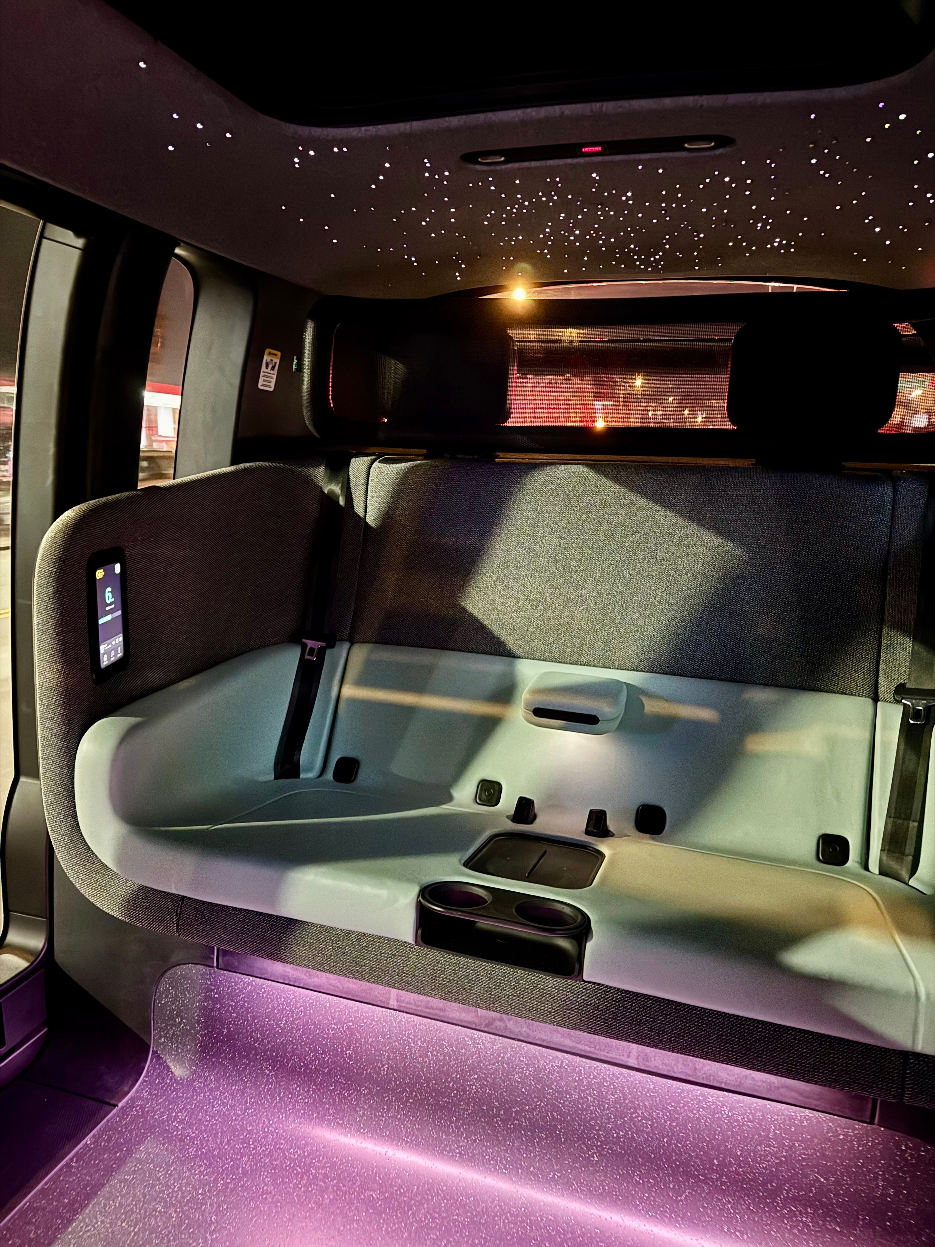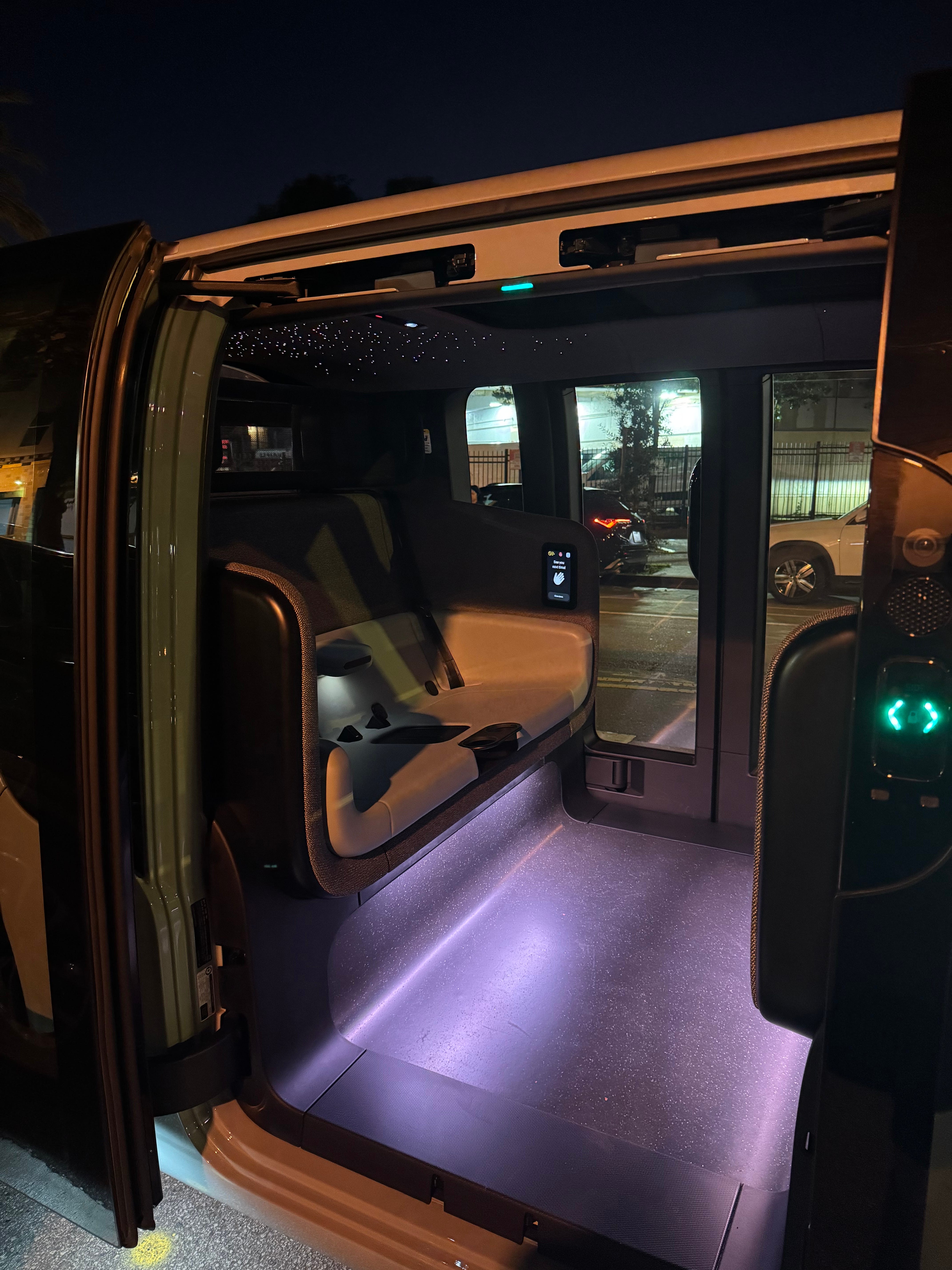 Then there are the magical touches that make the experience feel intentional rather than bolted on. I love the twinkling ceiling lights at night, and I remember being able to control the colors during a friends-and-family ride in Foster City, a feature I hope makes its way to public riders. Outside speakers play required backing up noises, while subtle, soothing music plays as the vehicle waits to pick you up. Inside, the sound and verbal cues - like opening and closing doors, buckling seatbelts, and starting and ending the ride - are clear without being intrusive, reinforcing that this experience was designed holistically, not pieced together. There’s something oddly satisfying and soothing about the signals when a ride starts or ends. I feel a sigh of relief and sense of wonder when I get in, consistent twinge of sadness when it cues the ride is ending, and a moment of accomplishment and satisfaction when I get out.