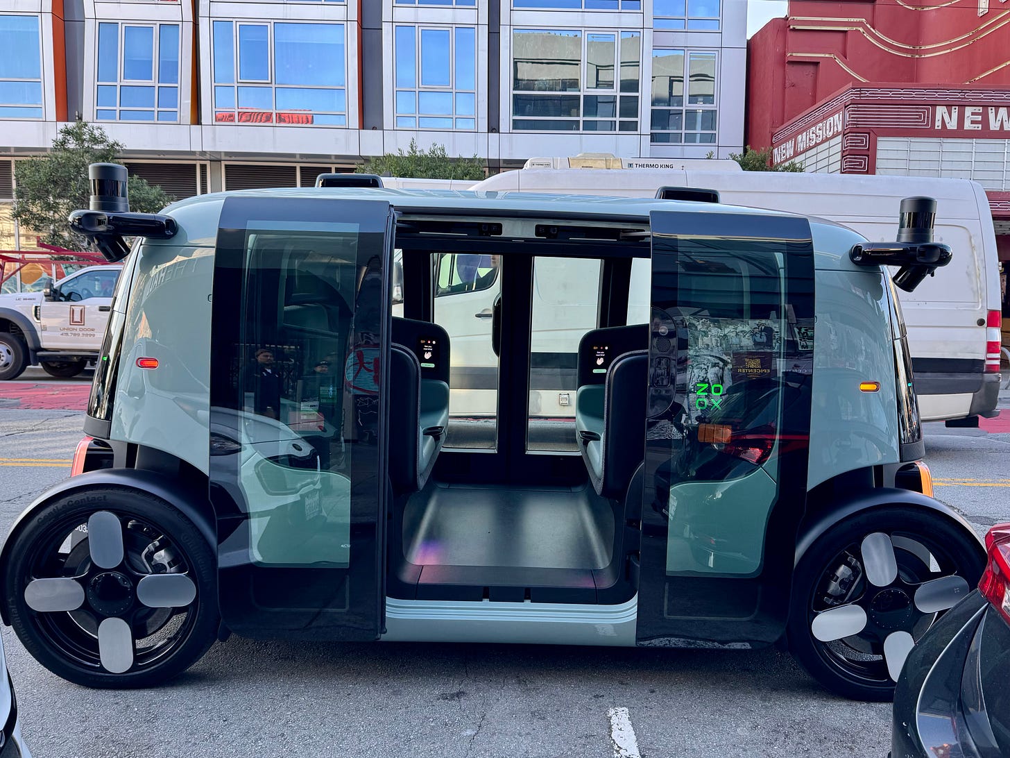 All of that said, Zoox understandably still feels like it’s in beta. Riding it requires patience and grace. The driving style is extremely cautious - much more so than Waymo or Tesla - to the point where pedestrians and bikers often take advantage. When unexpected things happen, it can slam on the brakes and feel jerky, and I’ve experienced a sliding feeling almost like a hockey stop. The four-wheel steering adds this extra layer of unfamiliarity, but I’m getting used to it.