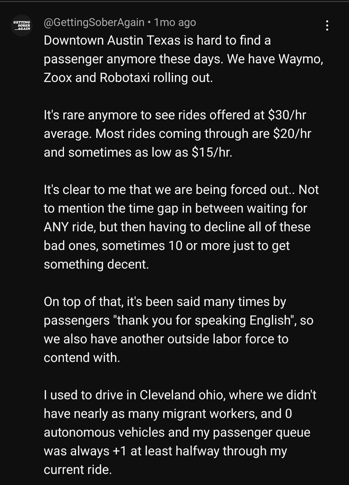 While it’s still early to measure the full impact of AVs across every U.S. market, Austin provides a telling case study. Companies like Uber and Lyft tend to focus solely on the data, and the data from Gridwise’s report is showing a small decline in earnings in most AV cities. But when you talk to real drivers, they tell a different story. I’ve always felt that perception can be more important than reality. So if drivers feel like they are earning way less, there’s clearly a large disconnect.
