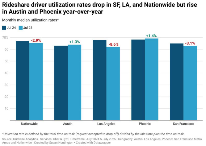 Driver utilization rates (the percentage of time spent with passengers vs. waiting) also dipped in two AV markets: down 8.6% in LA and 3.1% in San Francisco. Nationwide utilization dropped 2.9%, but Austin and Phoenix bucked the trend with modest positive gains of 1.3% and 1.4%, respectively.