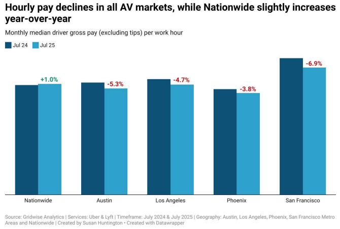 Human drivers in markets where autonomous vehicles are in play are now earning less. Hourly wages have dropped year-over-year (July 2024 to July 2025) across all four cities: 6.9% in San Francisco, 5.3% in Austin, 4.7% in Los Angeles, and 3.8% in Phoenix. Meanwhile, the broader national rideshare market actually saw a slight uptick in hourly pay of 1.0%.