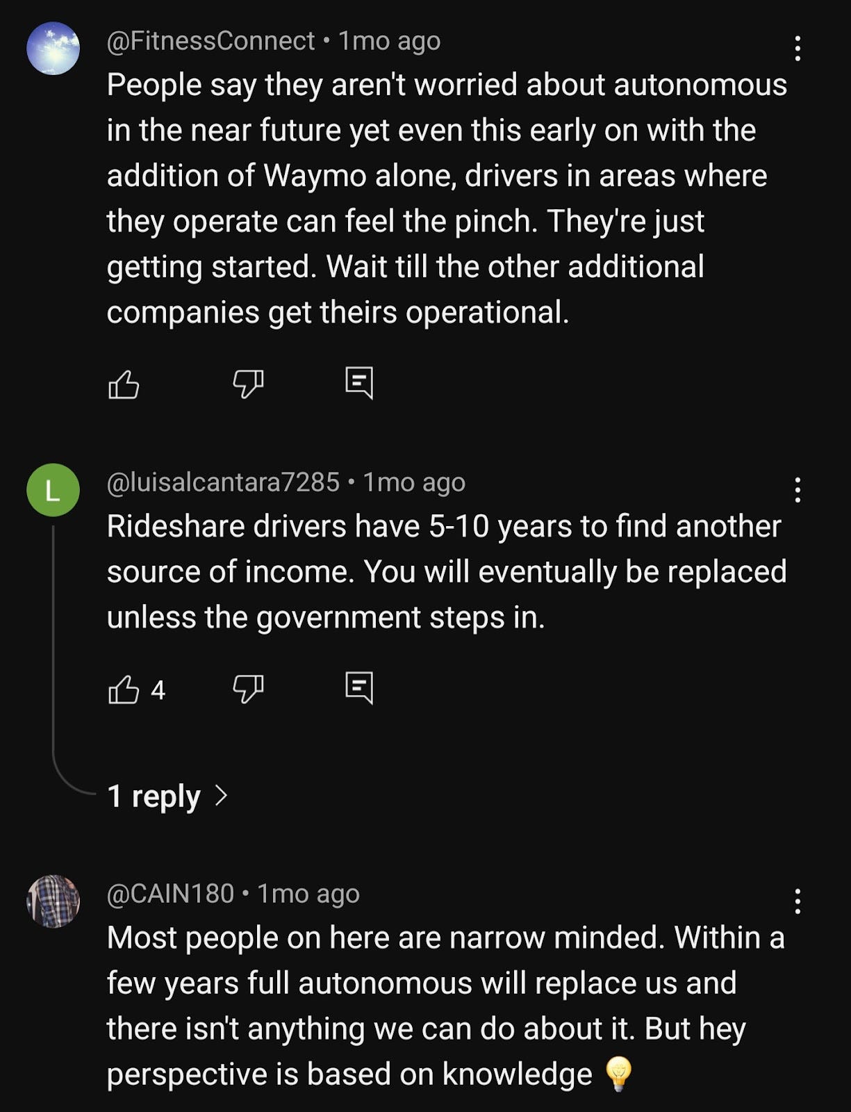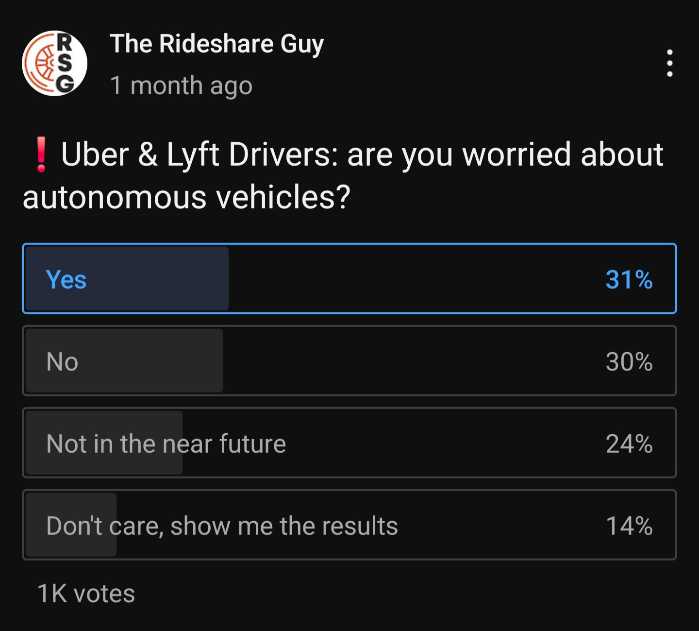 We recently ran an informal survey on our YouTube channel that gathered over 1,000 responses from our driver community, and the results were surprising. The central question asked whether drivers were concerned about the expansion of autonomous vehicles (AVs) into multiple major U.S. cities, a topic that has been gaining momentum over the past year. A third of respondents indicated that they are worried about how AVs could affect their livelihoods.