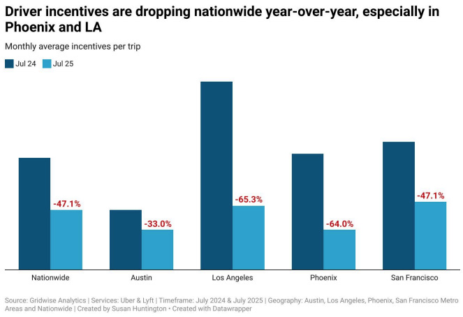Nationwide, per-trip incentive spending plunged 47.1%, but this was even more pronounced in certain AV-active cities: LA and Phoenix had over a 64% decline, while Austin's drop was milder at around 33% and actually below the national average. San Francisco mirrored the national average.