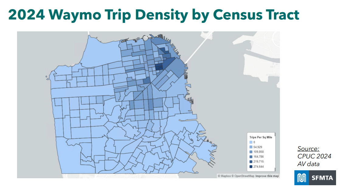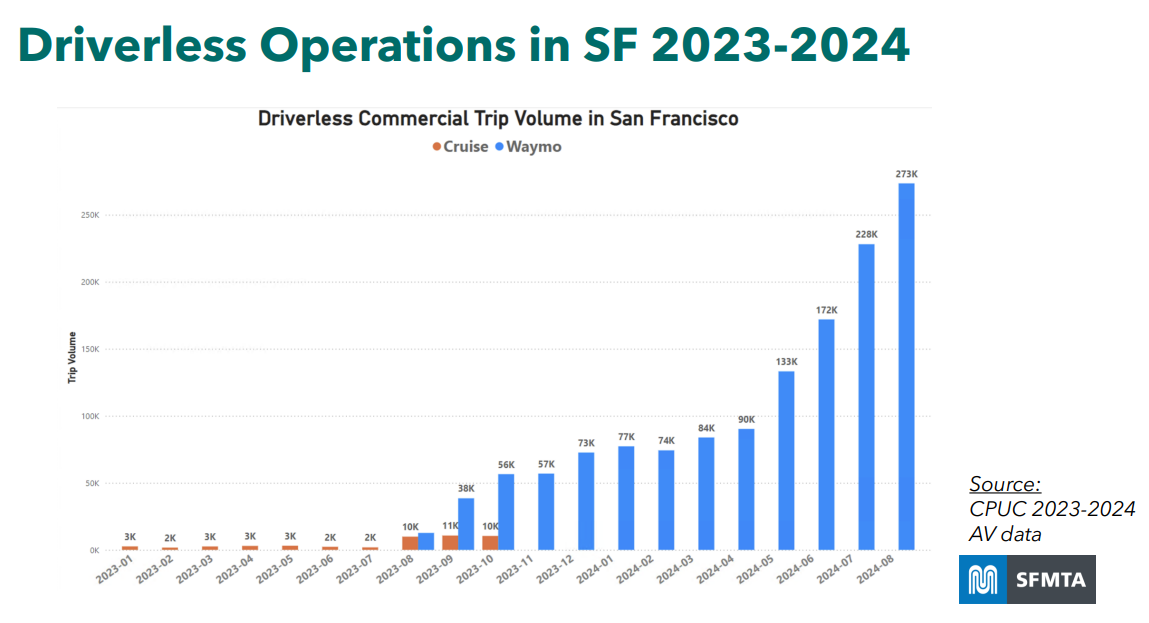 Interesting robotaxi data from SFMTA (h/t Benjamin Schneider). Waymo had a big summer, with 273K rides in August, while Cruise struggled with way fewer trips. Most of Waymo’s rides are in SF’s central, transit-heavy neighborhoods, which is no surprise since it’s the exact same product as rideshare.