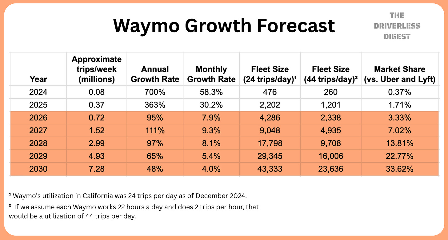 If I put my investor hat on for a minute, Waymo is still in the early stages of rapid growth. They’ve found PMF, and are starting to scale their main distribution channels (Seed-Series A equivalent), so 10-20% MOM growth would be strong. From 11/29/24 (175,000 rides) to 4/24/25 (250,000 rides), they were at an 8.57% MOM growth rate. So the methodology in this chart appears reasonable. I’m not sure why there’s a jump in growth rate in 2027 but I do think 8-10% MOM growth over the next few years is doable. And then 4-8% in the following years as the business matures/growth slows.