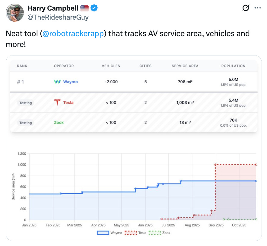 Tesla is trying to deceive investors into thinking it has San Francisco Robotaxis (link). I don’t normally like to pile on Tesla but this article raises a few interesting points. Tesla stated that it “launched ride-hailing service in the Bay Area using Robotaxi technology” but CFO Vaibhav Taneja also said “in the Bay Area, where we still have someone in the driver’s seat due to regulations, we crossed more than a million miles”. The former may technically be true but in practice, the current product is the same as having Uber drivers with Tesla FSD ferrying passengers around. Not exactly something you want to tell investors though.