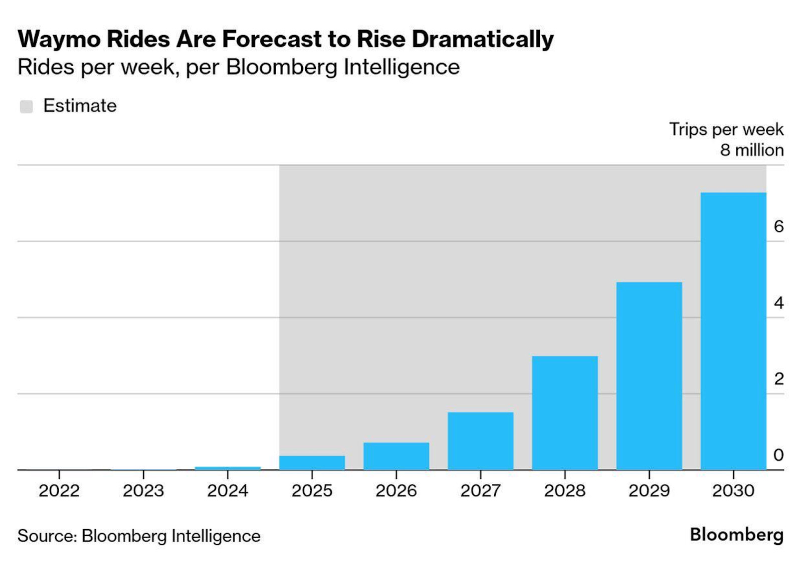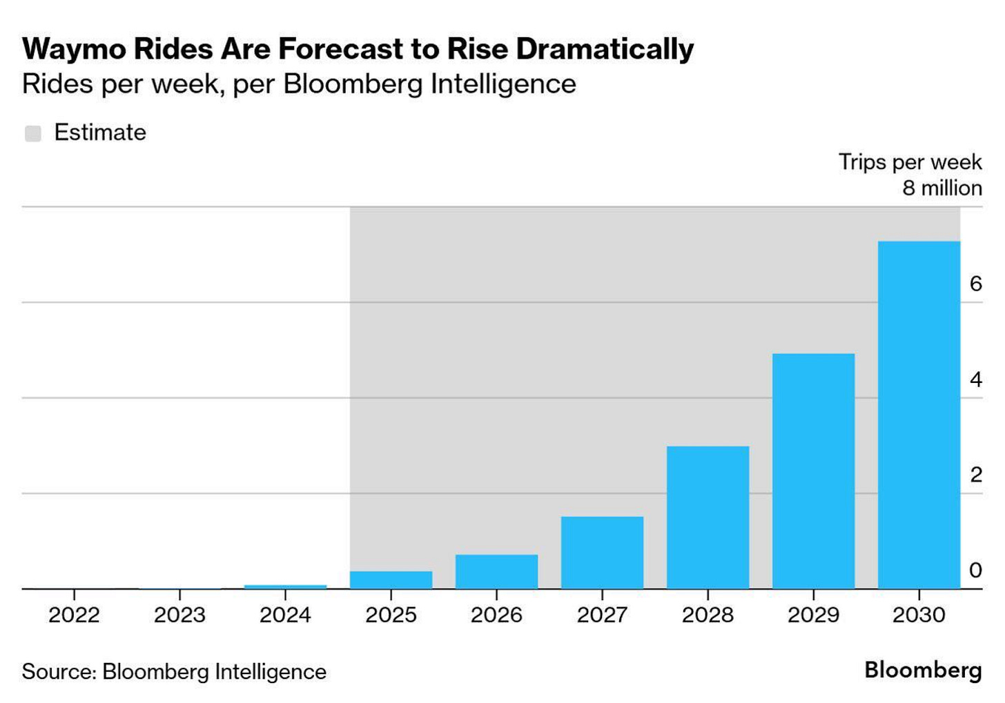 Waymo weekly ride projections per Bloomberg Intelligence (link). This chart was making the rounds this week on social media, but I wasn’t able to find any methodology on how they arrived at their predictions. So I did some additional calculations / fact checking: