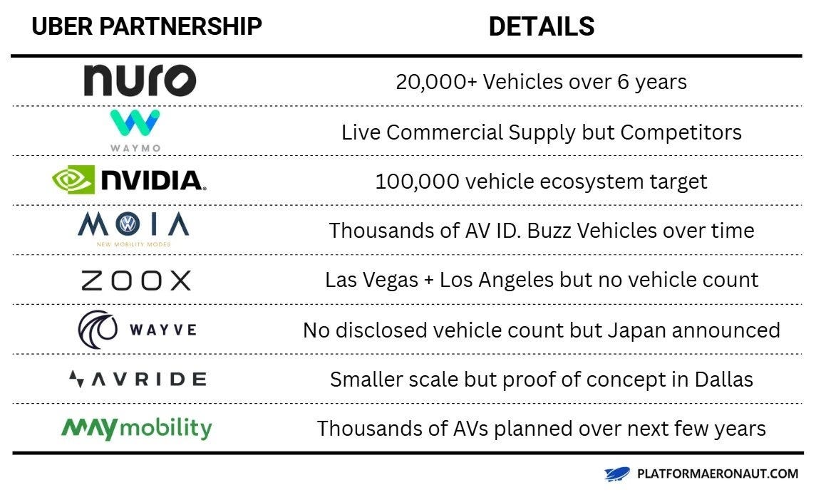That said, near to medium term, I’d be a bit concerned about Uber’s partnership with Waymo. Waymo has already announced a dozen-plus markets beyond Austin and Atlanta without Uber, which feels telling.