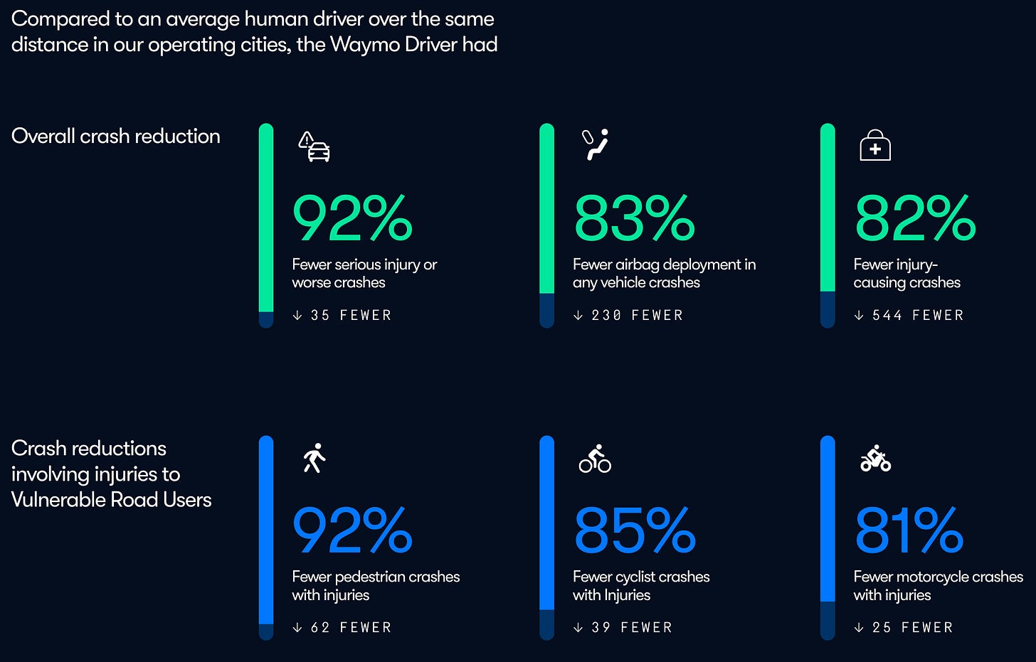 Waymo’s new safety data is in (link). Over 170M miles through Dec 2025, the Waymo Driver was involved in 13x fewer serious injury or worse crashes than human drivers in those same cities.