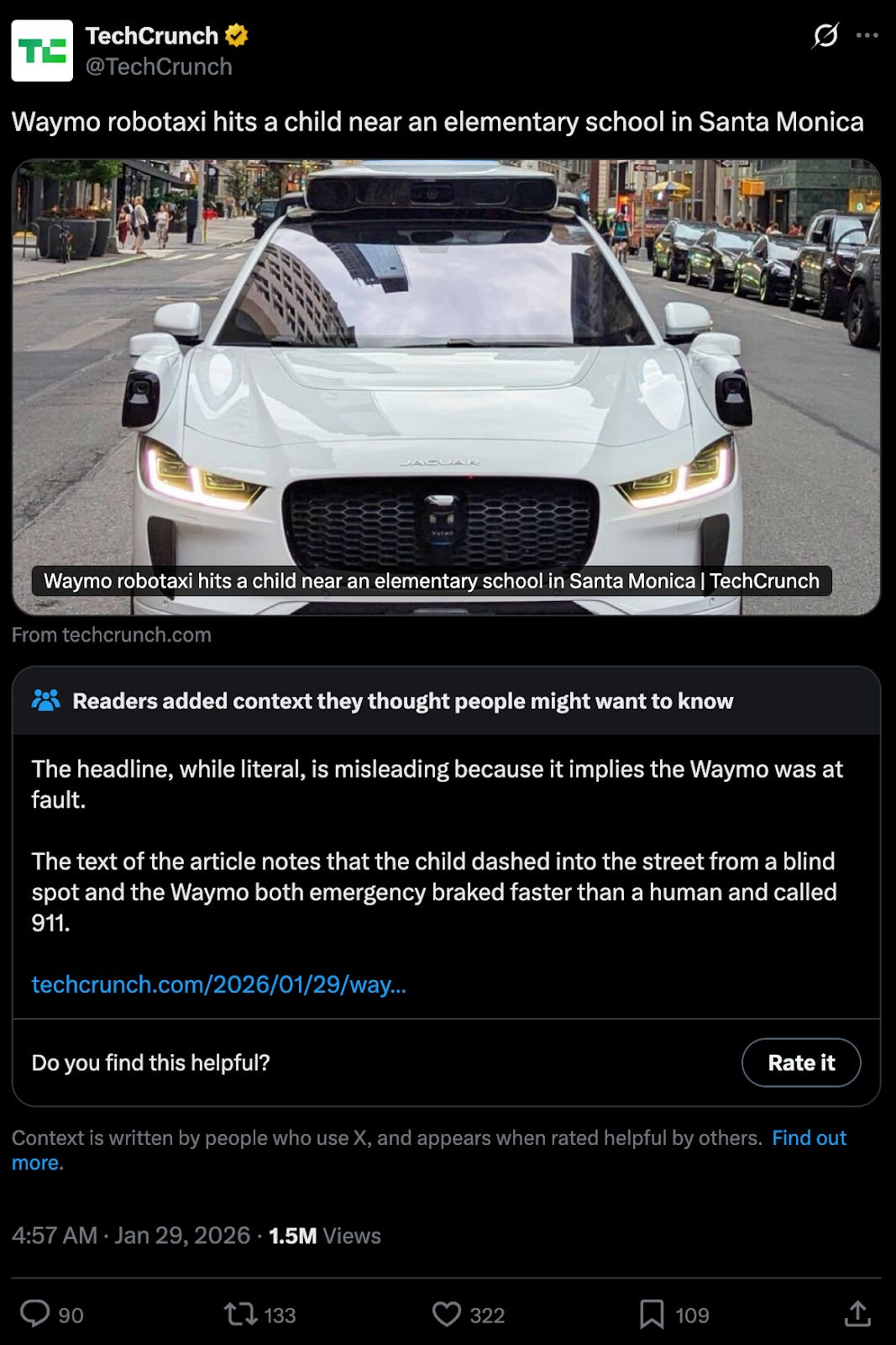 Waymo robotaxi hits a child near an elementary school in Santa Monica (link). According to Waymo, the robotaxi was traveling around 17 mph before braking “hard” and striking the child at approximately 6 mph, after the child suddenly ran into the vehicle’s path from behind a tall SUV. The child sustained minor injuries, and Waymo voluntarily contacted the National Highway Traffic Safety Administration the same day. In its statement, Waymo said that based on its analysis, a human driver in the same situation likely would have hit the child at approximately 14 mph, given the limited visibility and short reaction time. Here’s the full statement on the incident from Waymo (link).