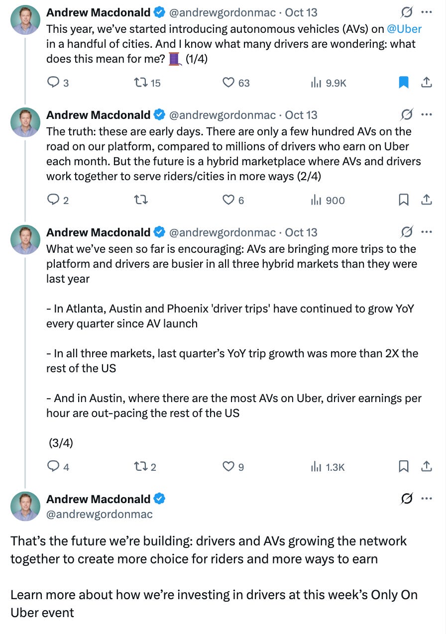 I’m glad that Uber is finally starting to talk about the impact of AVs on drivers but it seems like they don’t want to admit the elephant in the room: more supply has always meant lower hourly earnings for drivers. And saying ‘drivers are busier’ could actually be a bad thing if they’re doing more trips and getting paid less per trip (more trips also means more miles and expenses, which drivers are responsible for). Gridwise data showed that drivers were busier in AV cities, yet they were earning less than the national average, thus confirming this theory. Andrew also states that in Austin, ‘driver earnings per hour are out-pacing the rest of the US’ so that would imply that they are not in Atlanta and Phoenix? Ultimately, I need to see the actual data before taking Uber’s side on this one.