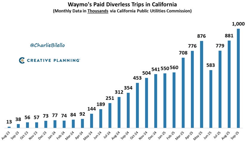 ‘Self-driving taxi company Waymo is now doing 1 million rides per month in California, a 3x increase over the past year and 26x increase over the past two years’ (link).