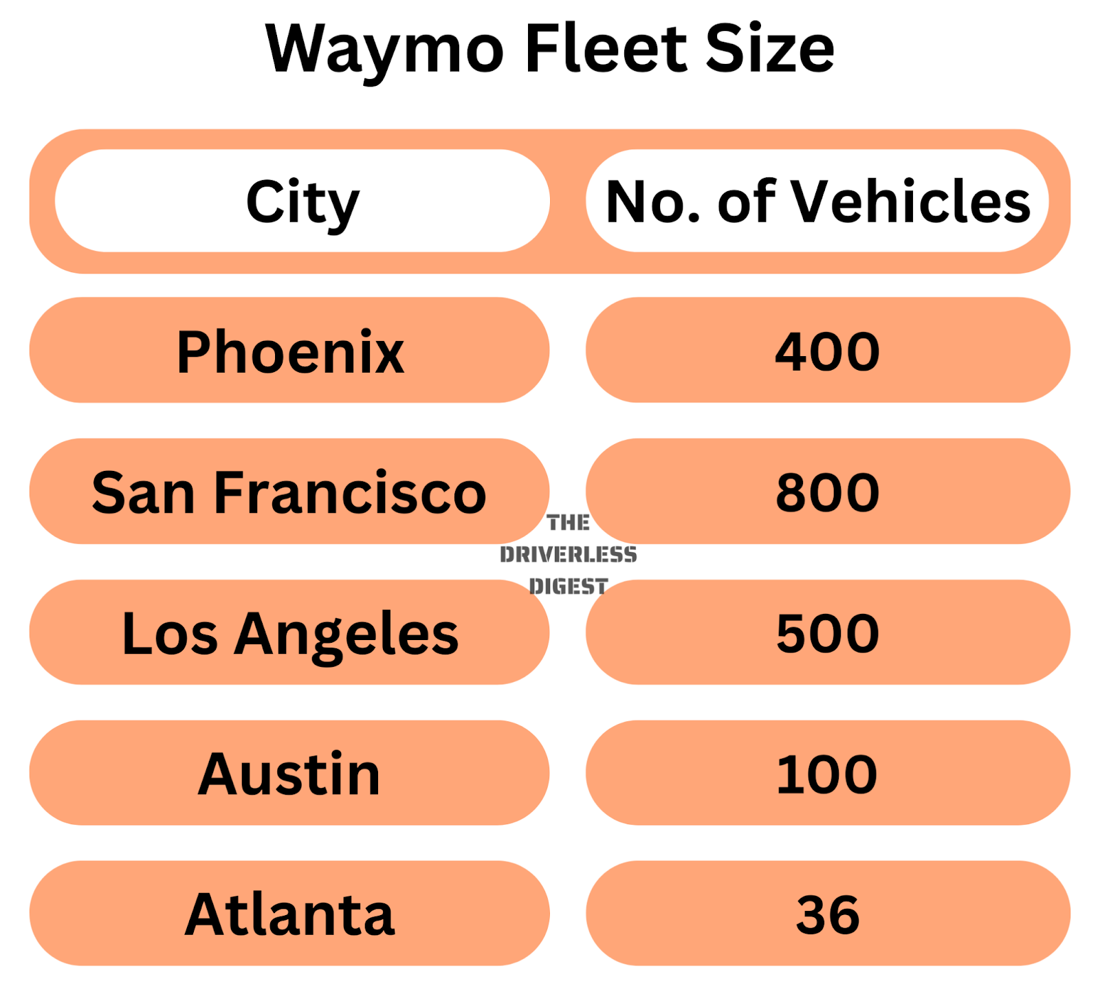Waymo also reported that their current fleet size is 2,000 vehicles as of Aug. 2025, with 400 in Phoenix, 800 in SF, and 500 in Atlanta. We assumed Austin still has 100 vehicles so that leaves 164 vehicles unaccounted for.