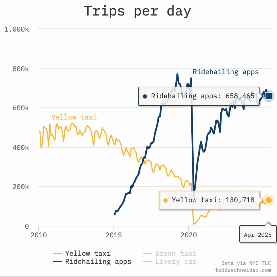 As of April 2025, there were 658,465 ridehail trips per day, and the average fare was $33.42 ($22 million of revenue per day). NYC is also more dense than San Francisco, where Waymo has a 20.5% market share, so if we assume that Waymo can eventually capture just 20% of the NYC market, that would translate to 921,851 trips per week1 (remember they’re at 250,000 trips per week in total across all five current markets so NYC alone could be 4x their existing footprint). And since we now know from Obi data that Waymo charges a 30% premium to ridehail, NYC could generate $40 million2 in weekly revenue for Waymo.