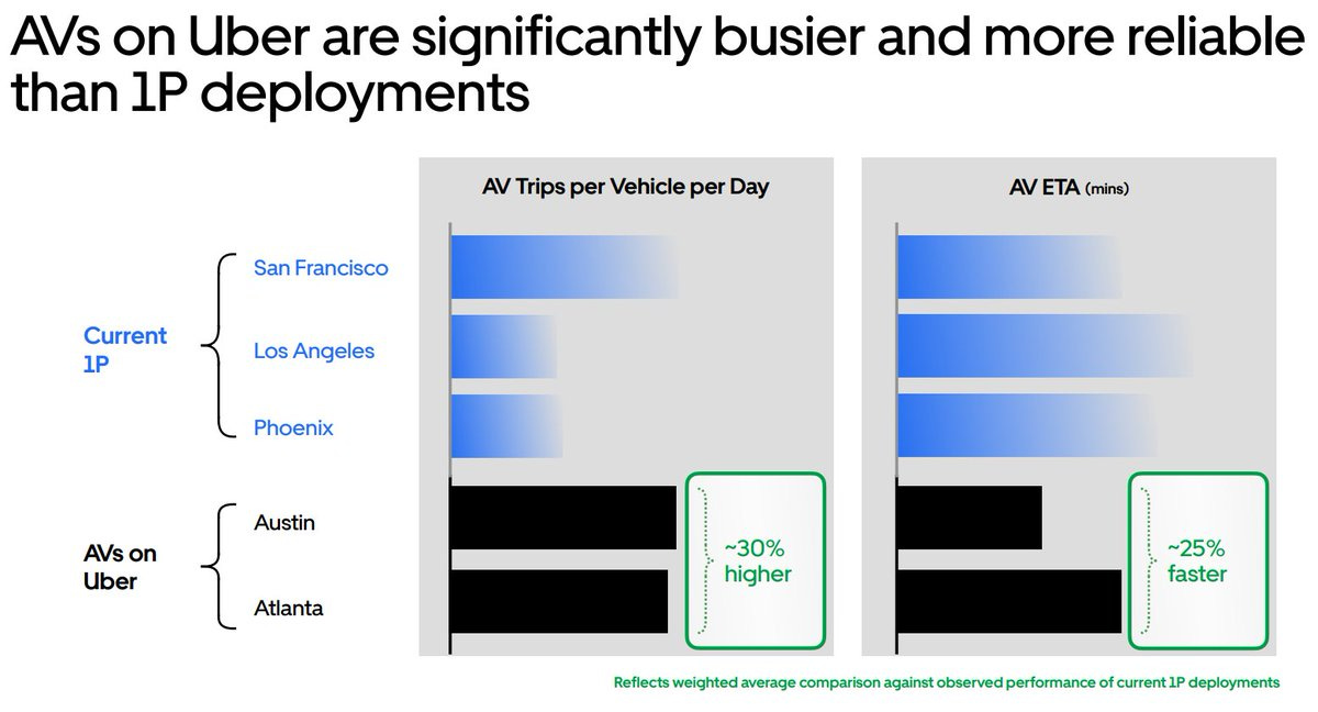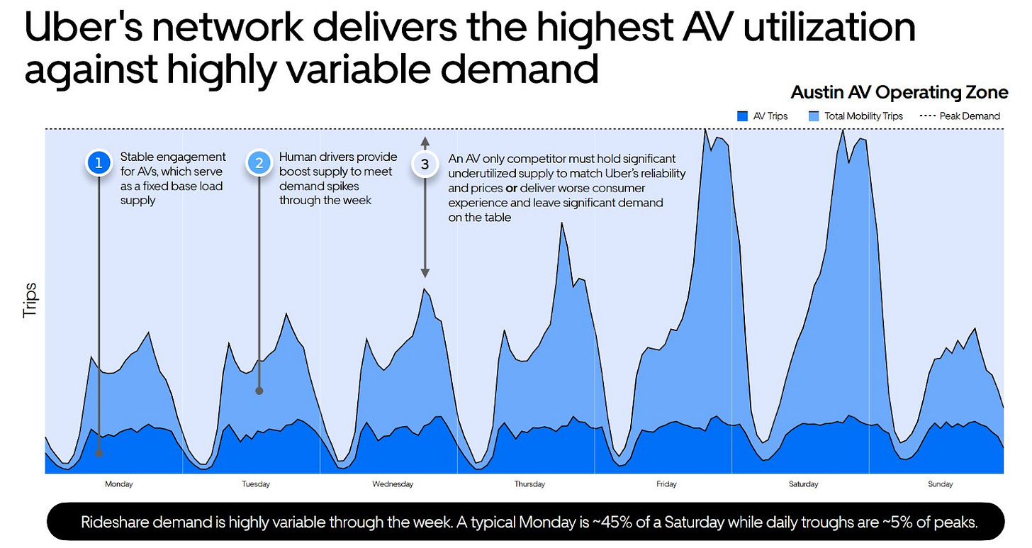 Uber’s AV argument makes sense. Rideshare demand is highly variable, which makes AVs a good fit for base load while human drivers handle peaks. But their first party benchmarks appear to be Uber’s own assumptions about Waymo utilization, rather than disclosed data. While the AVs on Uber’s platform reflect real performance and show about 30 percent higher utilization. I don’t think the conclusion is wrong, but the 1P numbers are highly sensitive to how those assumptions are set, and Uber did not share any methodology.
