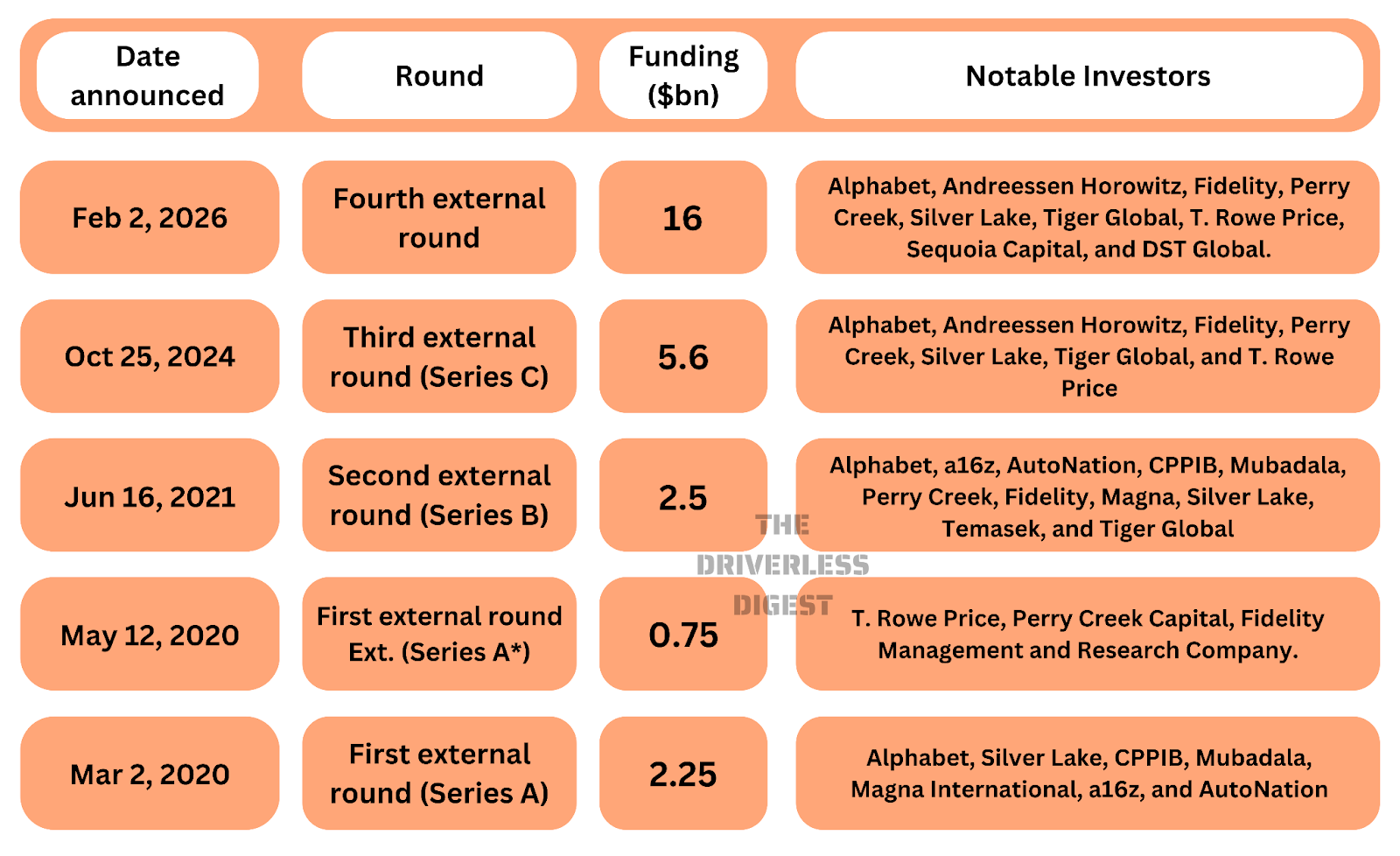 Waymo announces $16 billion funding round. This round values the company at $126 billion — more than double its 2024 valuation of $45 billion, and brings their total external funding to $27.1 billion. Alphabet led the raise once again, with a $13 billion contribution, according to exclusive reporting by Bloomberg (link), joined by returning investors like Andreessen Horowitz, Fidelity, Perry Creek, Silver Lake, Tiger Global, and T. Rowe Price. The round also brought in some new names, including Dragoneer Investment Group, DST Global, Sequoia Capital, Kleiner Perkins, and Alphabet’s own venture arm, GV.