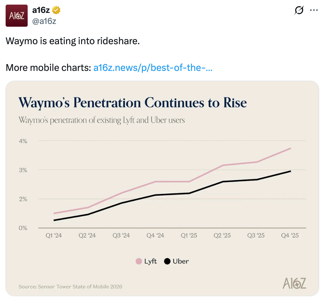 The Compound and Friends podcast with Josh Brown and Michael Batnick featured Mark Mulhern discussing autonomous taxis and the opportunity in Uber (link). Uber’s relationship with Waymo has become a major driver of investor sentiment. If Waymo were to pull cars from Austin or Atlanta, Uber’s stock would likely take a hit, while a new Waymo launch on Uber would likely be a clear positive. I agree with the hosts though, over a multi year horizon, Uber looks like a good buy, especially if it continues to establish itself as the default demand layer in a fragmented AV market.