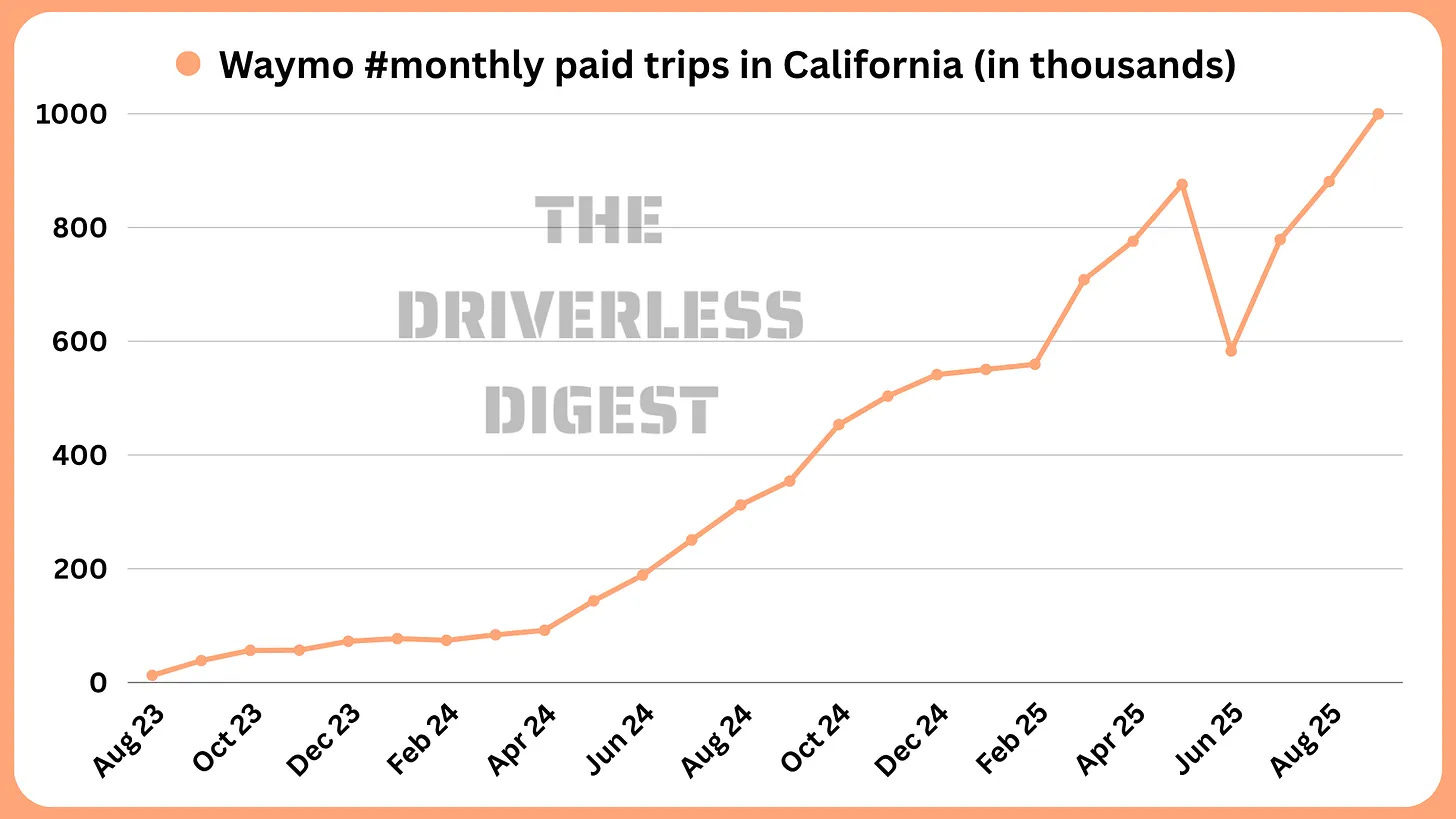 Waymo has been racking up some major milestones lately. One of the biggest according to new California Public Utilities Commission (CPUC) data: the company is now providing about 1 million paid rides per month in California. Here’s how that growth has played out over time1.