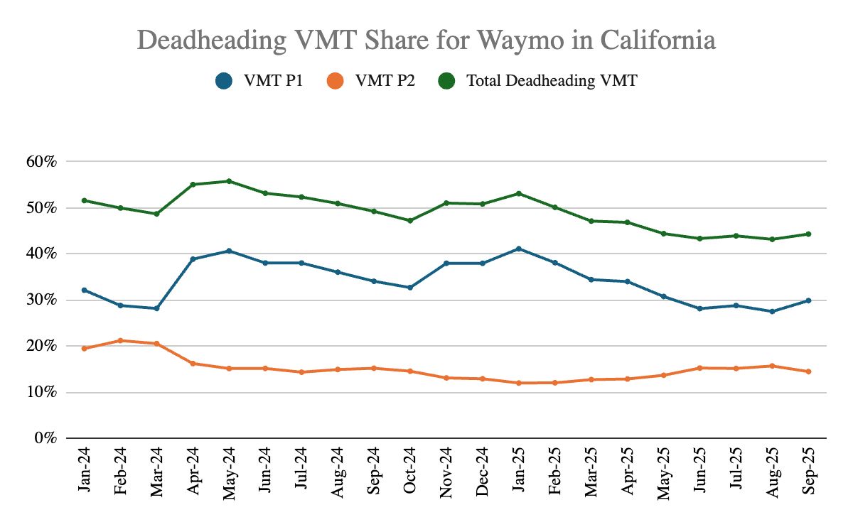 Looking at the CPUC data, a few things immediately stand out. Deadheading has improved from 51.5 percent in January 2024 to 44.3 percent in September 2025, but it’s striking how much of that still comes from P1. In recent months, roughly two-thirds of Waymo’s deadhead VMT in California falls into P1.
